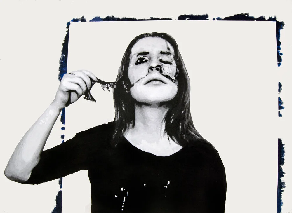 Karen Ösp Pálsdóttir uses a unique multi-step process to create her large scale portraits. She first begins with a silent performance with her subject. During this performance Pálsdóttir utilizes her subject as the canvas, painting directly onto their skin, primarily their faces. “The layered paint on my subjects face develops into a mask which represents their projected layered personal history. When they discard their painted mask, it represents a reclamation of the self.” Using documentation from her performances, Pálsdóttir then has a reference to begin her paintings. “I create my paintings by dissecting my images into multiple digital layers, creating an accumulated image over time. The process always begins with a black silhouette of the portrait and finalizes with small white transparent marks.”