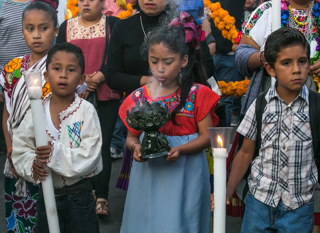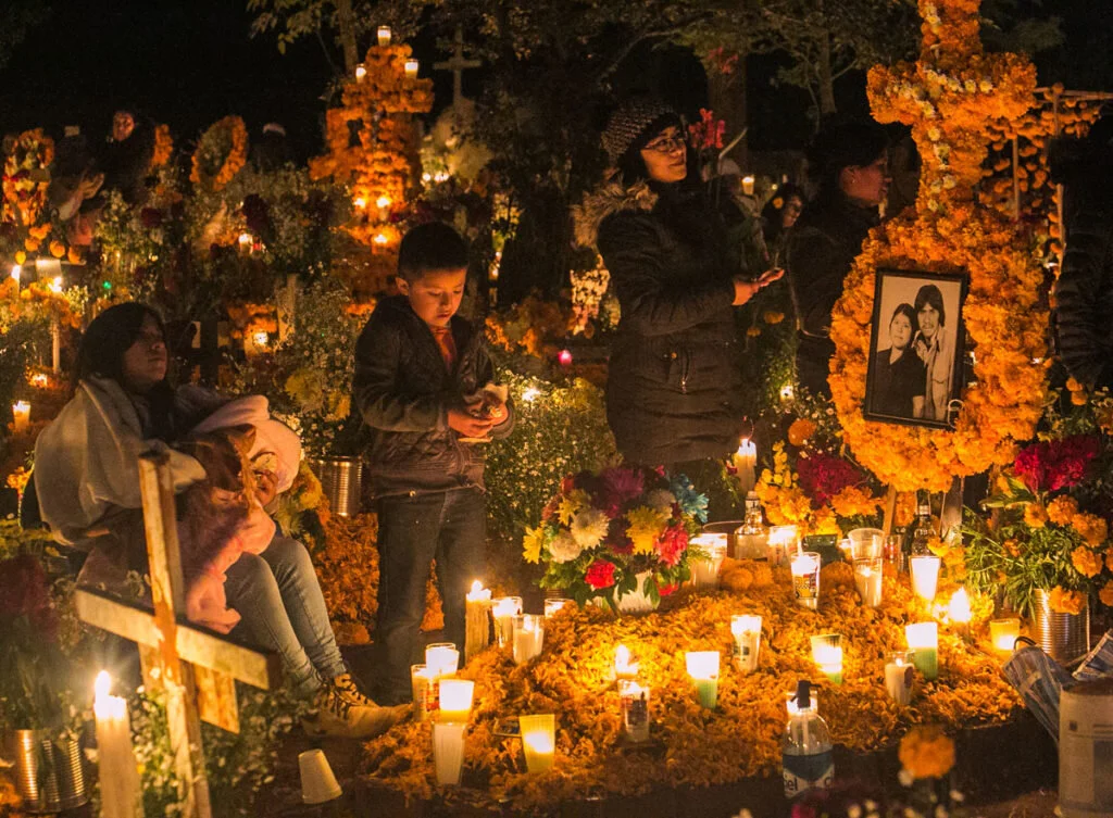 Families work tirelessly, creating some of the most elaborately decorated grave sites in all of Mexico. Spirits are high, and families reminisce together over homemade dinners as they prepare for the evening. When families arrive at the gravesites, musicians surround them as they set up the altar face, light the candles, and burn copal (or incense). The copal aroma is said to purify the souls of the dead as they enter the world of the living. The mariachis serenade the families as they call upon their loved ones. After they leave, the family settles in to eat, drink, and reminisce.
