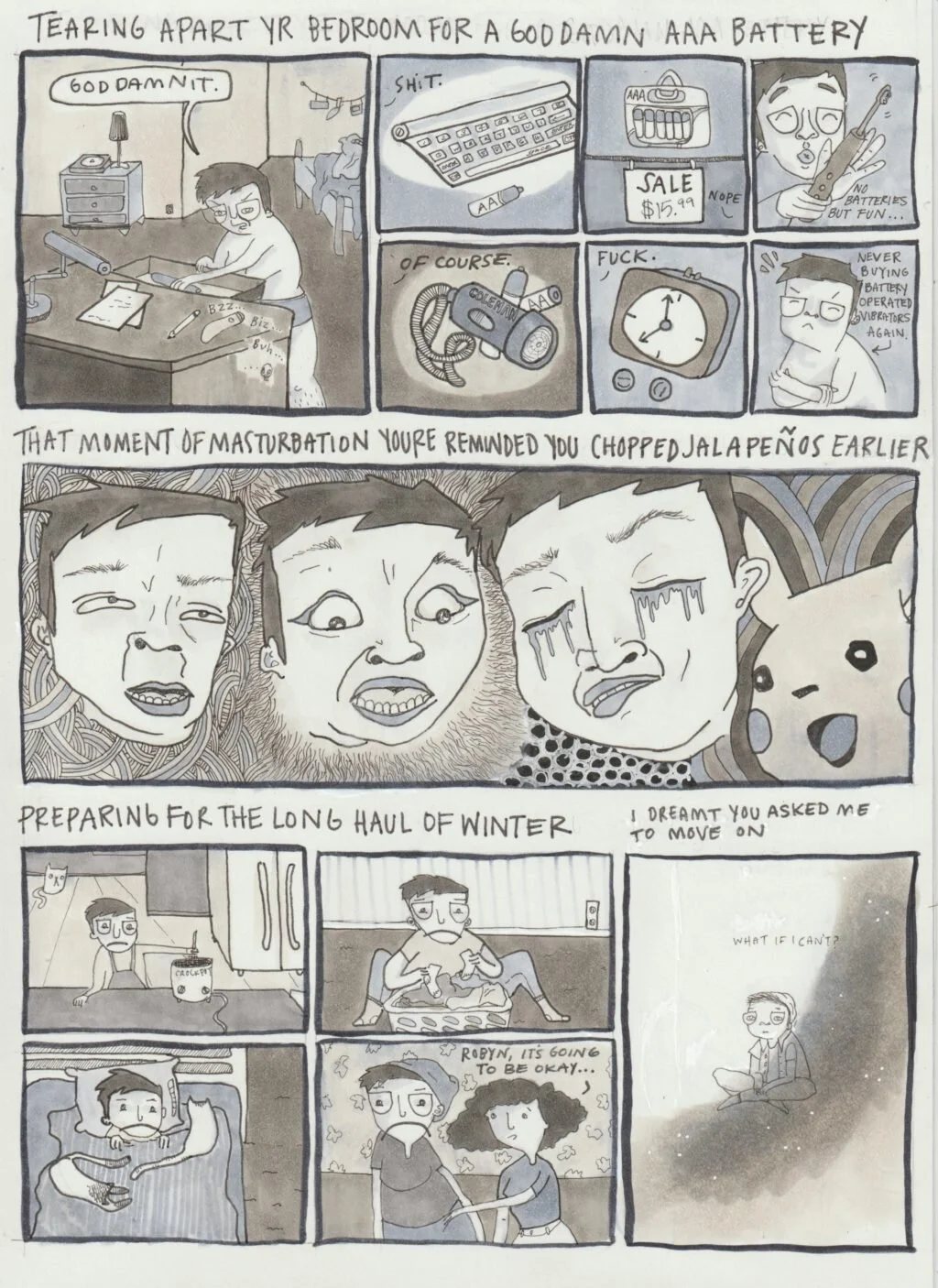 Robyn Bateman writes things and draws stuff in Portland, Oregon. Their biweekly comic series College was published by NAILED Magazine in the spring and summer of 2013. Robyn is now the author and illustrator of Failing Haus, an autobiographical comic chronicling the small and big events of life, shamelessly. Robyn is also the author of "Oh," a book of poetry exploring emotional trauma and recovery. They make books and other rare artifacts with Lovely Book Club, formerly Dimsummer, a small press dedicated to never meeting deadlines.